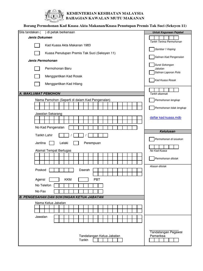 Kementerian Kesihatan Malaysia Bahagian Kawalan Mutu Makanan Borang Permohonan Kad Kuasa Akta Makanan Kuasa Penutupan Premis Tak Suci Seksyen 11
